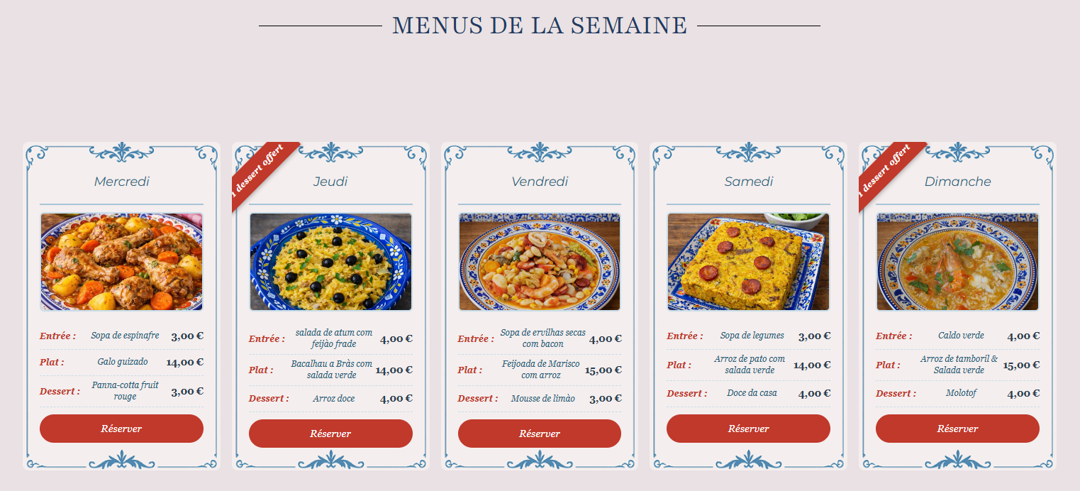 Découvrez nos menus journaliers où la saveurs authentiques de nos recettes , vous ferons voyager au Portugal .